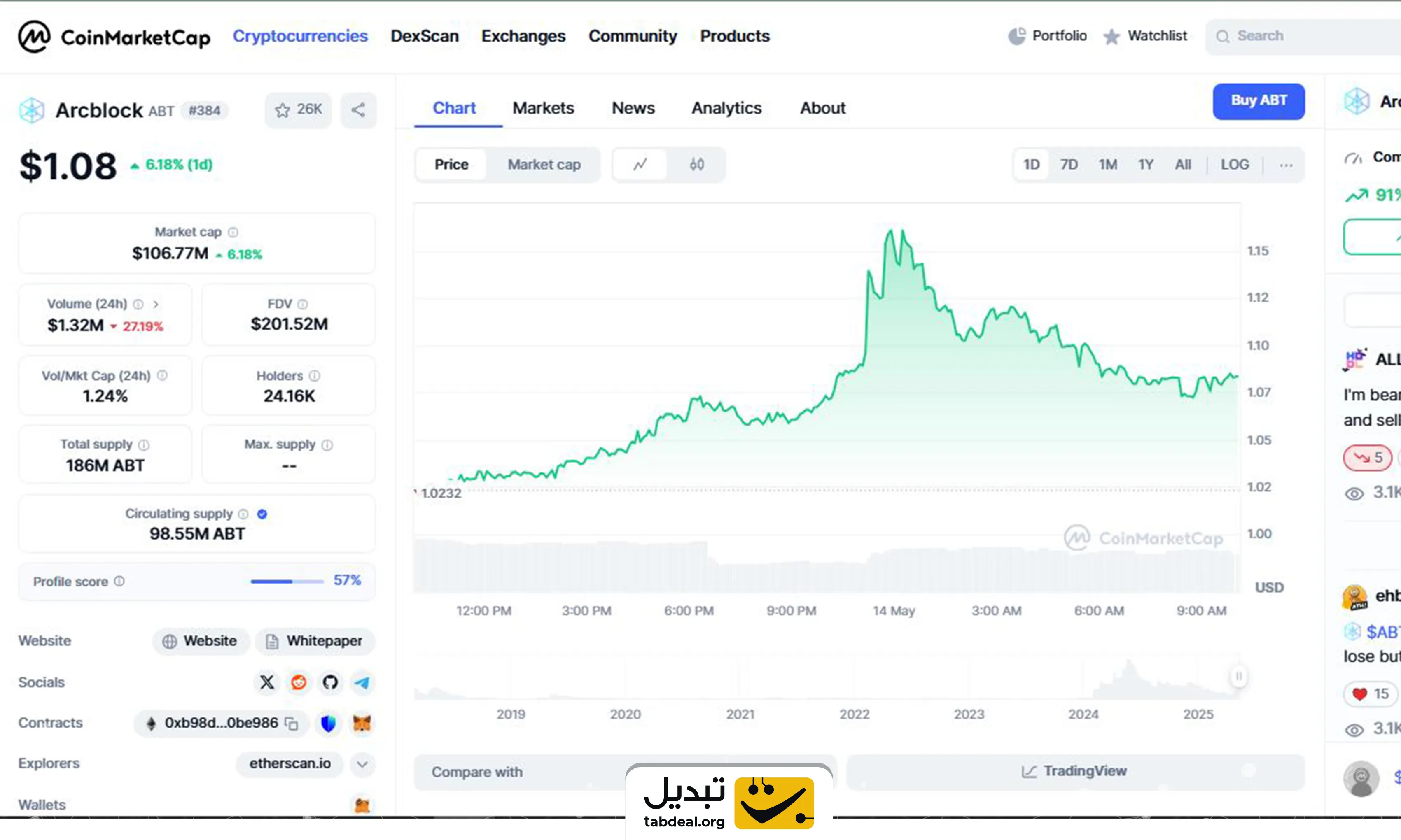 ارز دیجیتال Arcblock با نماد ABT توکن بومی این شبکه است. این پلتفرم به عنوان بستری برای ساخت اپلیکیشنهای مبتنی بر بلاک چین طراحی شد. توکن آرک بلاک با ۱۰۶.۷۷ میلیون دلار ارزش کل بازار در رتبه ۳۸۴ ام بازار قرار گرفته است. تا این لحظه ۹۸.۵۵ میلیون توکن از موجودی کل این توکن یعنی ۱۸۶ میلیون ABT را خریداری کردهاند. قیمت توکن ABT در زمان نگارش ۱.۰۸ دلار است و با احتساب قیمت تتر امروز یعنی ۸۳۶۵۵ تومان، قیمت این توکن در حدود ۹۰۳۴۷ تومان است.