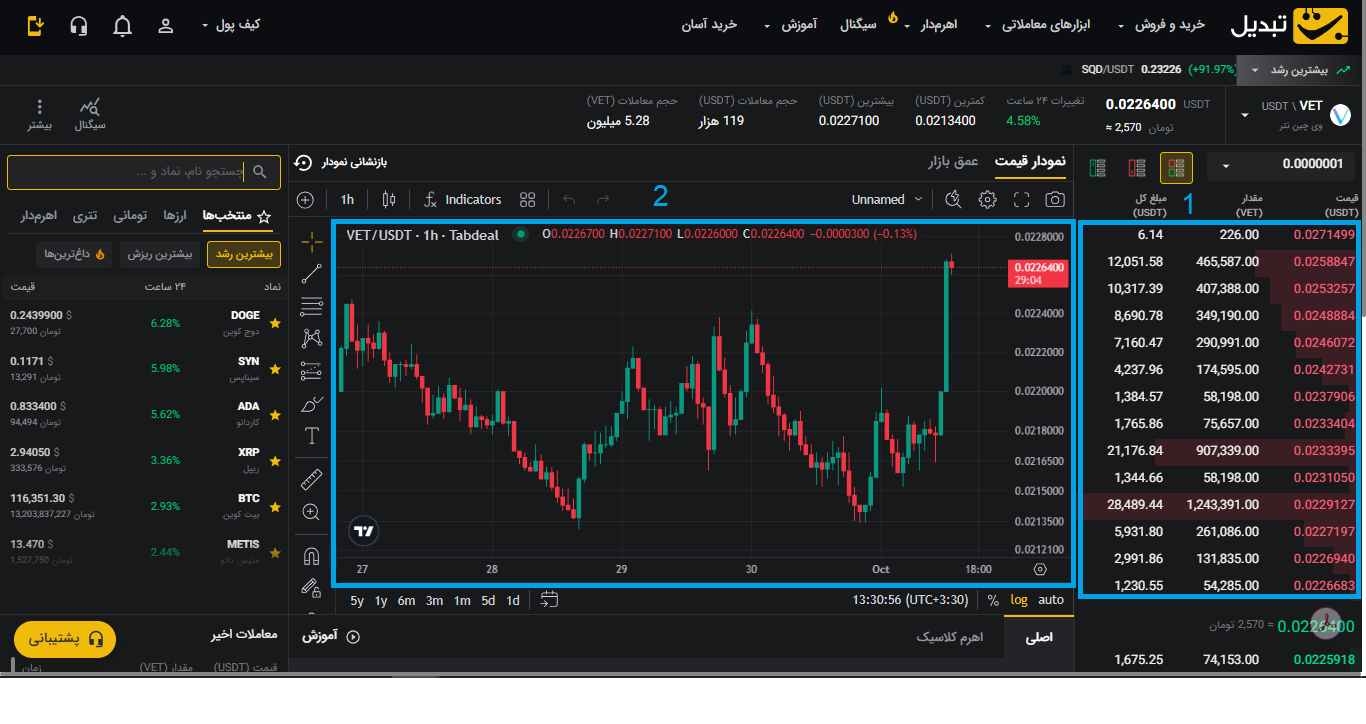 در مرحله بعدی وارد صفحه معاملات میشوید. ستون سمت راست که تصویر شماره ۲ با کادر آبی و عدد ۱ مشخص است، دفتر سفارشها (Order Book) را نشان میدهد؛ عمق فروش/خرید و قیمتهای لحظهای در این بخش قابل مشاهده است. بخش میانی که با عدد ۲ در تصویر متمایز شده، نمودار قیمت لحظهای وی چین (کندل/خطی) را نمایش میدهد؛ میتوانید تایمفریم، اندیکاتورها و حالت نمایش را تغییر دهید و رفتار قیمت را ارزیابی کنید.