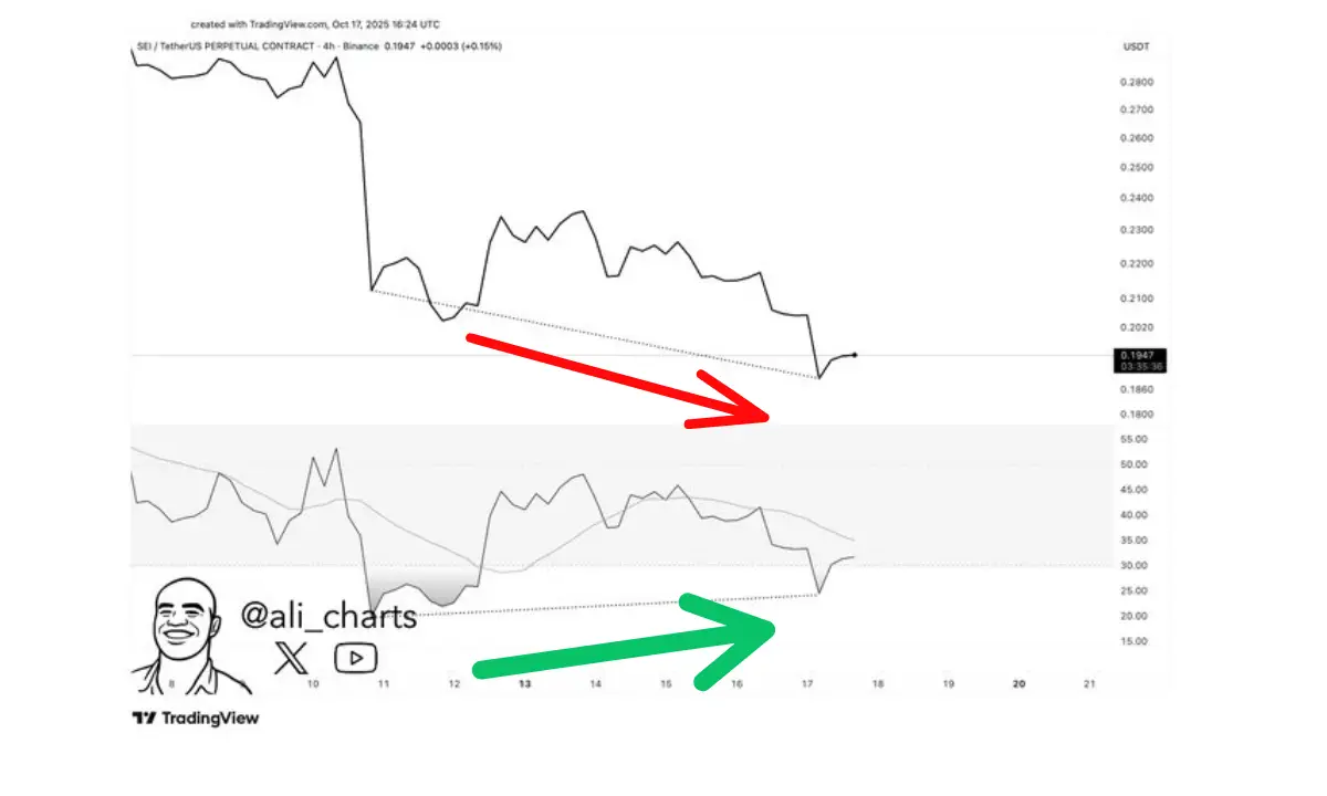 اولین و مهمترین سیگنال، یک «واگرایی صعودی» (Bullish Divergence) در اندیکاتور شاخص قدرت نسبی (RSI) در نمودار ۴ ساعتهٔ SEI است. همانطور که در نمودار به اشتراک گذاشته شده از سوی مارتینز مشاهده میشود، در حالی که قیمت به کفهای پایینتری (Lower Lows) دست یافته، اندیکاتور RSI کفهای بالاتری (Higher Lows) را ثبت کرده است.