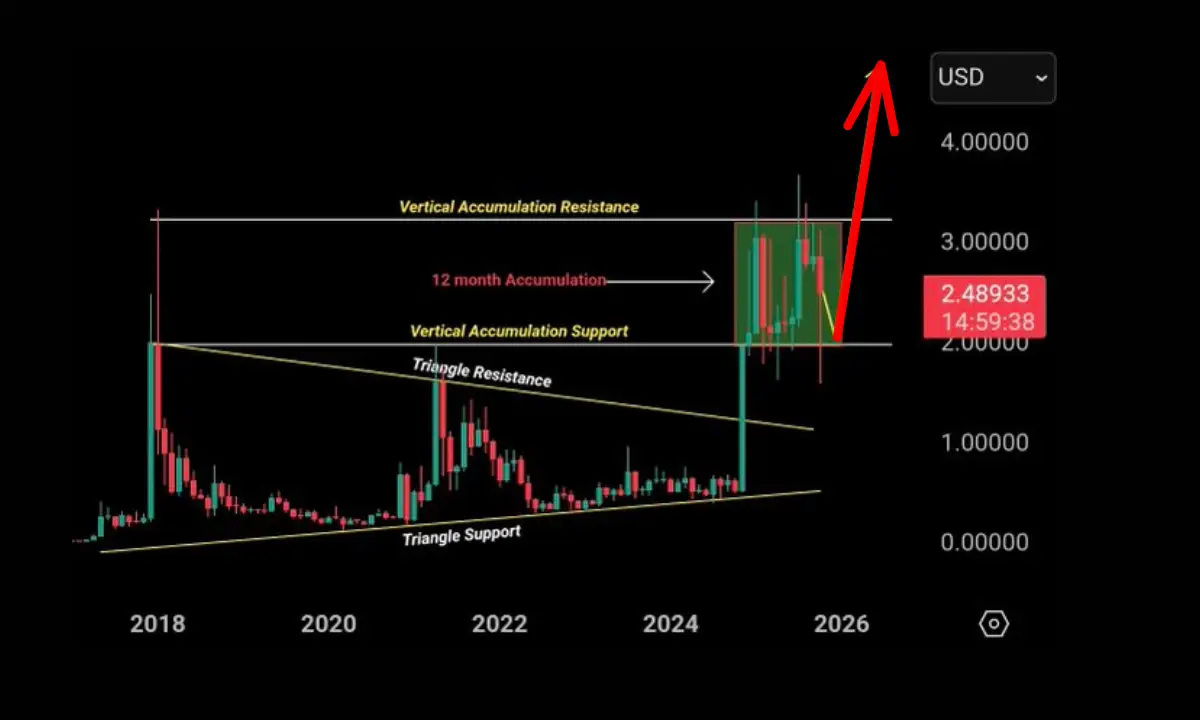 • تبدیل مقاومت به حمایت: به گفتهٔ تحلیلگر «چارت نرد»، قیمت اکنون برای نزدیک به ۱۲ ماه است که در حال تثبیت و انباشت بالای این مقاومت شکسته شده (در محدودهٔ ۲ تا ۳ دلار) است. این پایداری، نشان‌دهندهٔ قدرت خریداران و عدم ضعف در روند است.