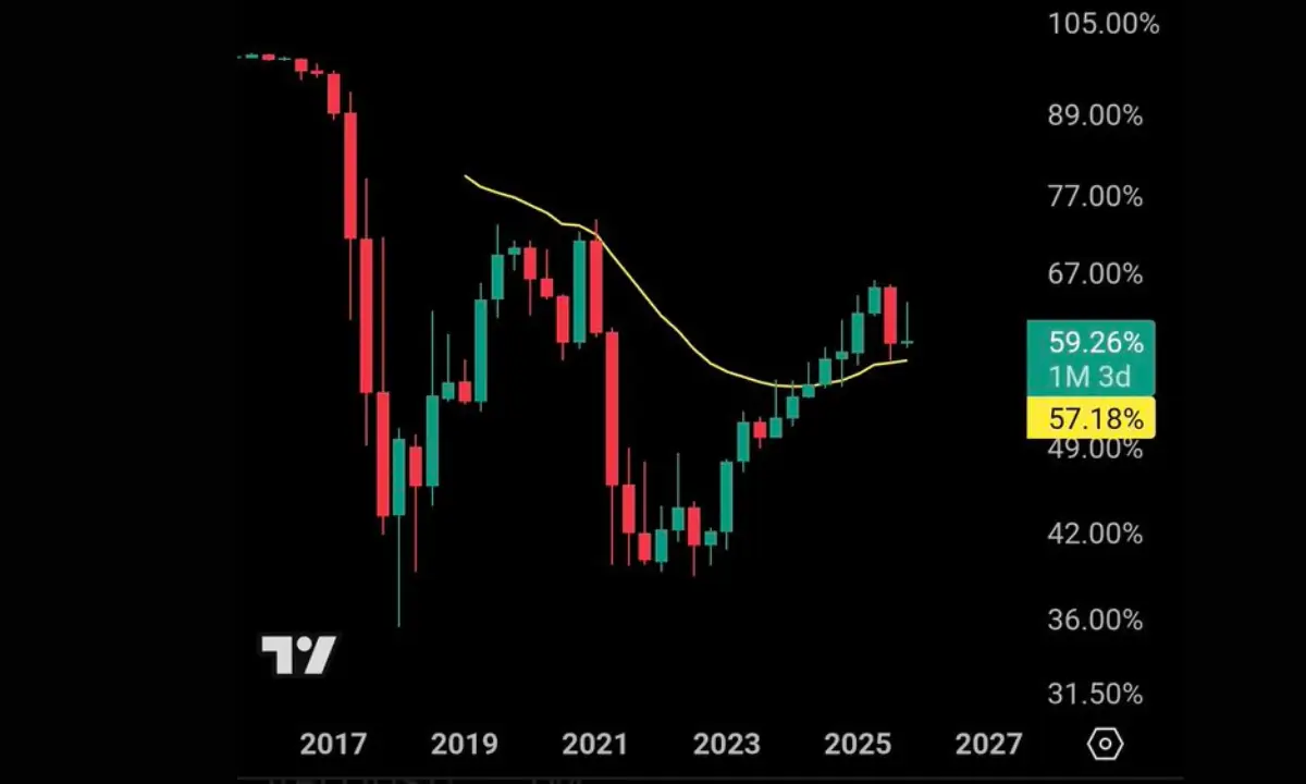در نمودار به اشتراک گذاشته شده، ChartNerd به یک خط روند میانگین متحرک (Moving Average) زردرنگ اشاره میکند که نقش حمایت و مقاومت دینامیک را برای دامیننس بیت کوین ایفا کرده است.