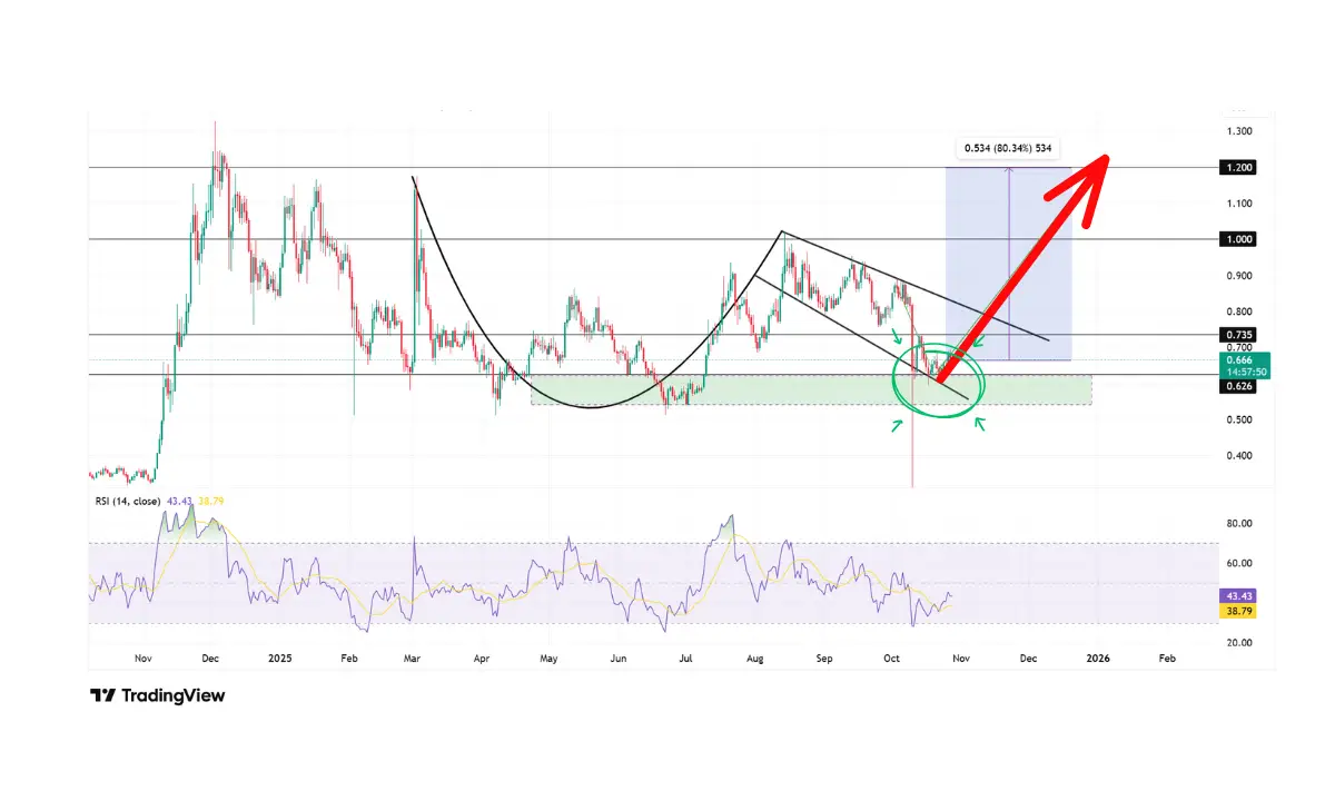 قیمت کاردانو که در حال حاضر در محدودهٔ ۰.۶۶ دلار در حال تثبیت است، پس از جهش از یک ناحیهٔ تقاضای قوی، یک الگوی کلاسیک و بسیار صعودی به نام «فنجان و دسته» (Cup and Handle) را در نمودار روزانهٔ خود تشکیل داده است.