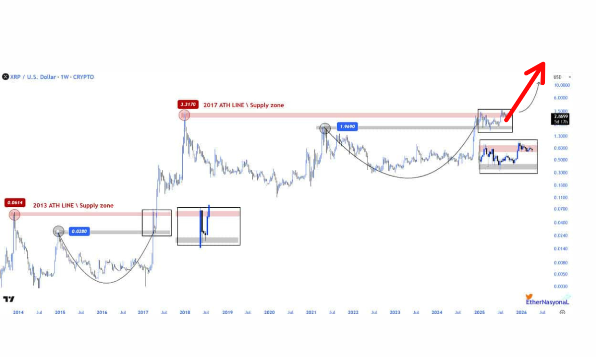 تحلیل نمودار بلندمدت ریپل از سال ۲۰۱۳ تاکنون نیز این دیدگاه صعودی را تقویت میکند. تحلیلگر EtherNasyonaL نشان میدهد که ساختار کلی قیمت XRP از یک الگوی تکرارشونده پیروی میکند: دورههای طولانی تثبیت و حرکت خنثی، و به دنبال آن، یک حرکت صعودی انفجاری.