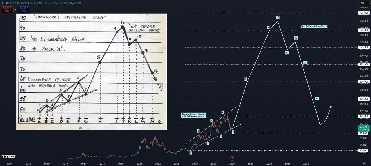 در قلب این تحلیل، الگویی کلاسیک از بازارهای مالی دیده میشود؛ الگویی که ریشه در آموزههای قدیمی جسی لیورمور دارد. در این ساختار، بازار ابتدا وارد فاز انباشت میشود؛ جایی که سرمایهگذاران بزرگ، آرام و پیوسته وارد موقعیت خرید میشوند. سپس با افزایش حجم معاملات و شکست مقاومتها، روند صعودی شتاب میگیرد و قیمت وارد فاز رشد انفجاری میشود.