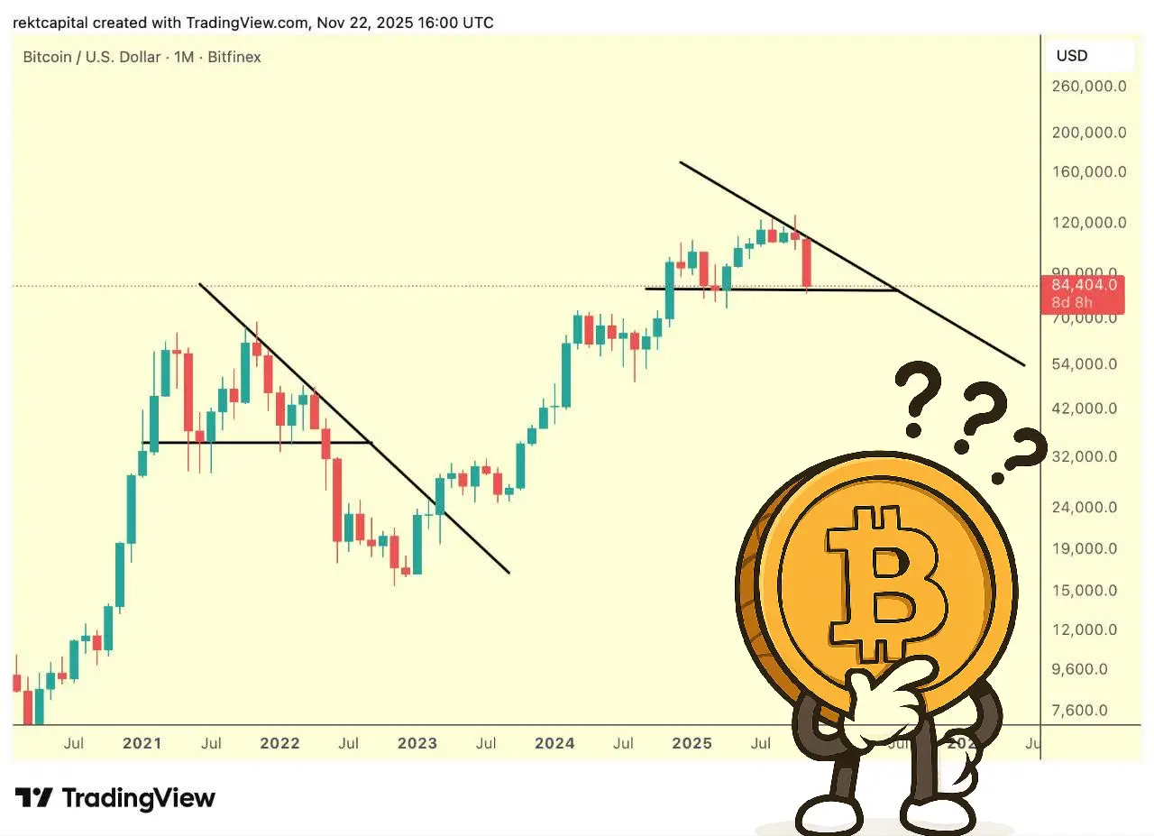 بر اساس نمودار ماهانه، بیت کوین در حال حاضر روی پایه الگوی (Macro Descending Triangle) قرار گرفته است؛ محدودهای که در حدود ۸۲۰۰۰ دلار حمایت اصلی این ساختار را تشکیل میدهد. در صورت از دست رفتن این سطح، شتاب نزولی میتواند وارد فاز جدیدی شود و مطابق تحلیل RektCapital، بازار وارد یک تایید کامل روند نزولی ماکرو خواهد شد.
