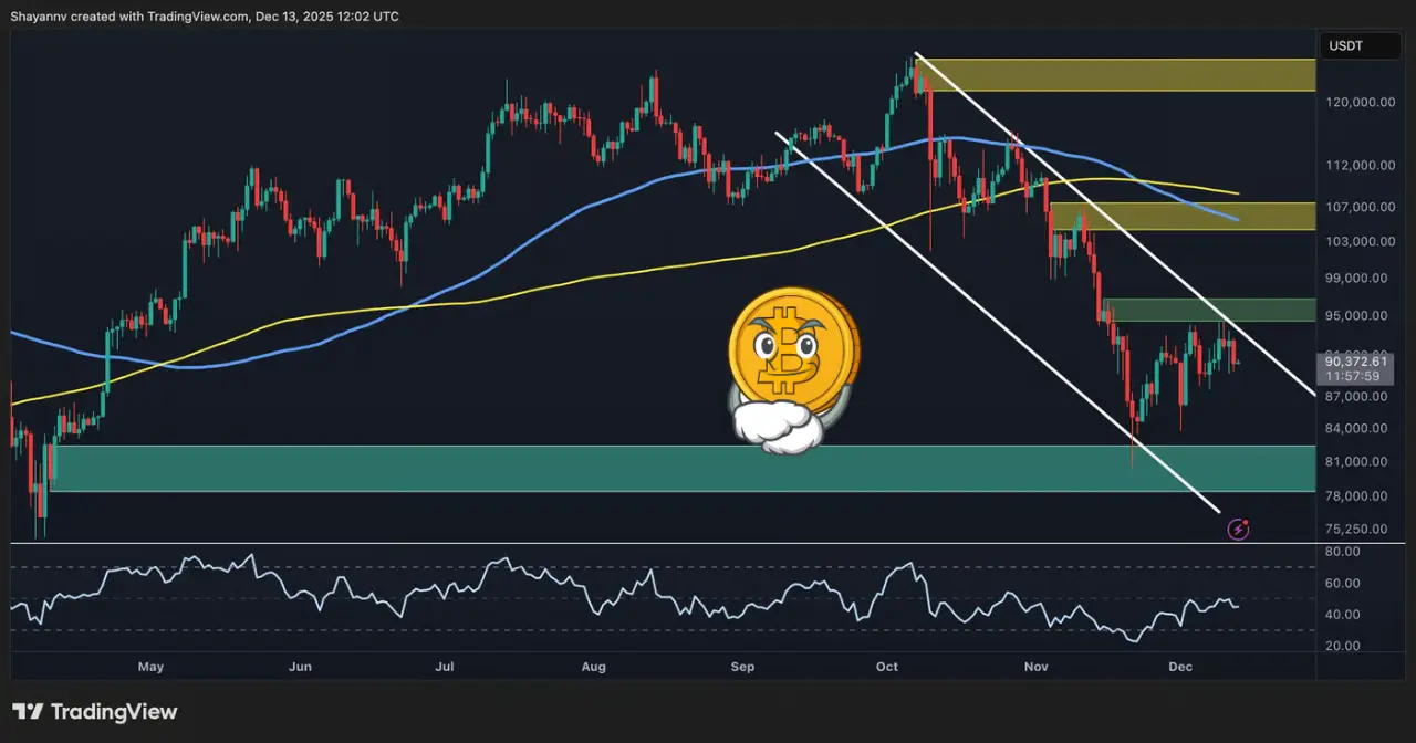 با این حال، هر حرکت صعودی در محدوده ۹۵ هزار دلار متوقف شده است. این سطح درست در نزدیکی سقف کانال نزولی و یک ناحیه مهم عرضه قرار دارد که فشار فروش در آن بهوضوح افزایش مییابد. علاوه بر این، قیمت همچنان پایینتر از میانگین متحرکهای ۱۰۰ روزه و ۲۰۰ روزه معامله میشود؛ میانگینهایی که در محدوده حدود ۱۰۷ هزار دلار قرار گرفتهاند و شیب نزولی دارند.