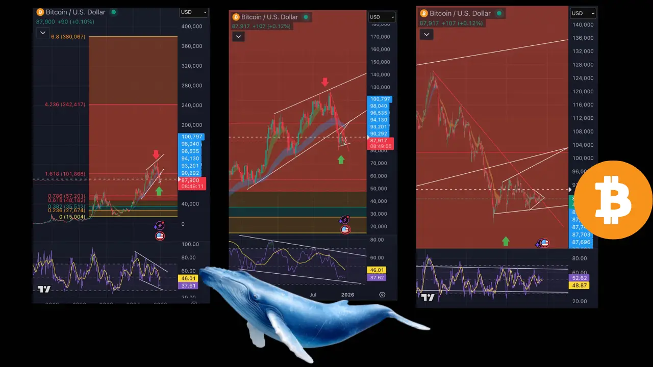 در تصویر هفتگی، فلش سبز رنگ نشان میدهد که انتظار میرود قیمت از محدوده فعلی (حدود ۸۷،۹۰۰ دلار) که با حمایتهای تکنیکال همپوشانی دارد، به سمت بالا پرتاب شود. نمودار ۴ ساعته نیز با جزئیات بیشتر، فشردگی قیمت در انتهای کنج را نشان میدهد؛ جایی که فنر قیمت جمع شده و آماده رها شدن است.