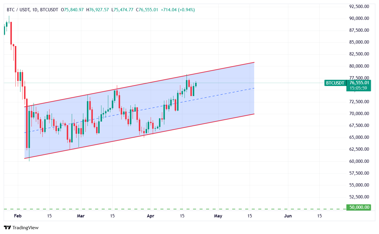 قیمت بیت‌ کوین (BTC) امروز به حدود ۷۶,۴۶۶ دلار و به مرز بالایی یک کانال صعودی که از فوریه (بهمن ۱۴۰۴) شروع شده، رسید.