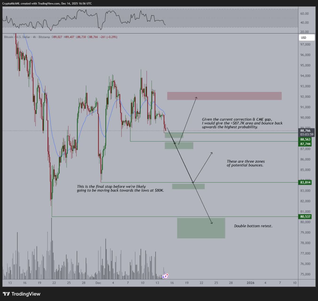 اولین و محتملترین سناریو، حرکت بیت کوین به سمت محدودهی ۸۷,۸۰۰ دلار، جمعآوری نقدینگی (sweep) در این سطح و سپس بازگشت قیمت به سمت بالا است. اهمیت این ناحیه زمانی بیشتر میشود که بدانیم یک گپ قیمتی در بازار معاملات آتی CME تا سطح ۹۰,۴۰۰ دلار وجود دارد.
