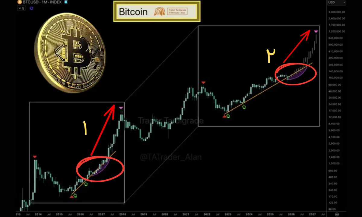 | ۲۰۲۵ (اکنون) | شکست کندل ماهانه + حرکت روی خط روند | (پیشبینی مشابه) |