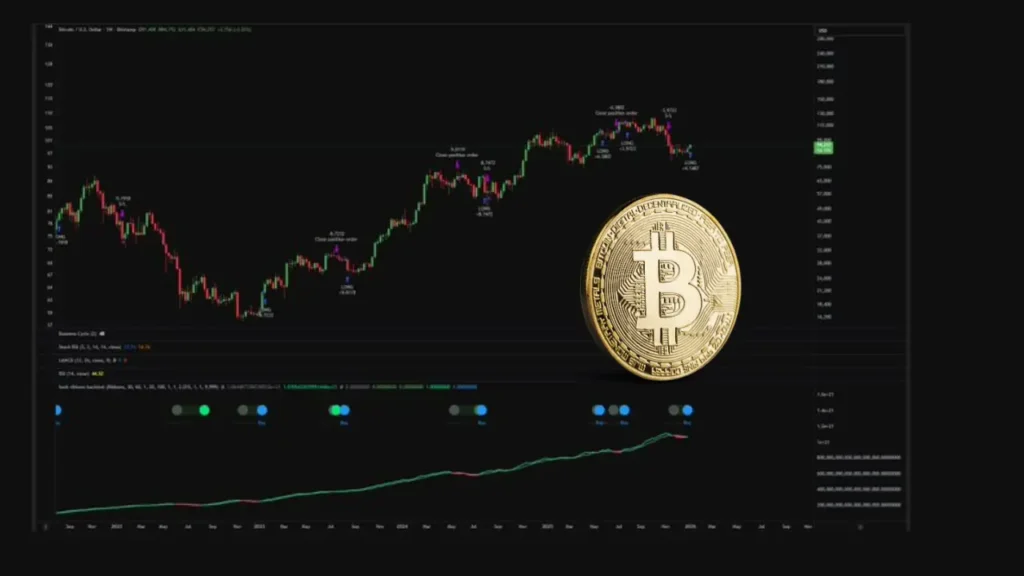 - روند تاریخی: با بررسی گذشته نمودار در سالهای ۲۰۲۳ و ۲۰۲۴، مشاهده میشود که هر بار پس از ظهور دایرههای آبی رنگ (سیگنال خرید هش ریبون)، قیمت بیت کوین وارد یک رالی صعودی قابل توجه شده است.