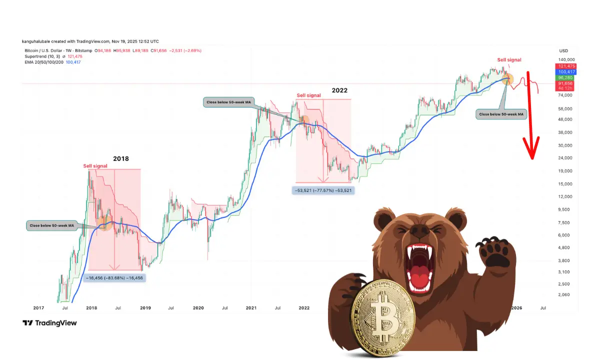 اندیکاتور سوپر ترند (SuperTrend) بیت کوین در نمودار هفتگی، یک «سیگنال فروش» صادر کرده است؛ رویدادی که از نظر تاریخی آغازگر یک بازار خرسی بوده است. این سیگنال نگرانکننده، با بسته شدن کندل هفتگی بیت کوین در زیر میانگین متحرک ۵۰ هفتهای روز یکشنبه، تأیید شد.