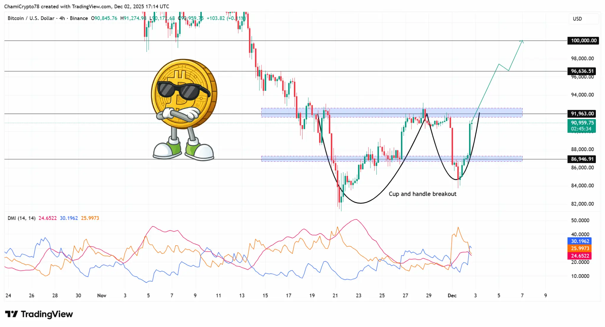 در زمان نگارش این مقاله، بیت‌ کوین با قیمت ۹۰,۹۵۹ دلار معامله می‌شود. نمودار قیمت نشان‌ دهنده یک الگوی فنجان و دسته واضح است که به صورت تاریخی مسیر رشد به سطوح بالاتر را پیش‌بینی می‌کند.