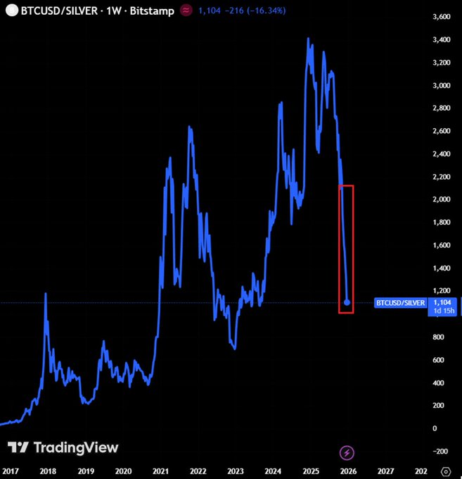 اما دو ماه و نیم گذشته برای هولدرهای بیت کوین بیرحمانه بوده است. قیمت اکنون به زیر ۹۰،۰۰۰ دلار سقوط کرده و عملکرد سالانه آن در محدوده منفی (بیش از ۶ درصد زیان) قرار گرفته است. طبق دادههای Kobeissi Letter، این تضاد عملکرد باعث شده نسبت قیمت بیت کوین به طلا و نقره به پایینترین حد چند سال اخیر برسد.