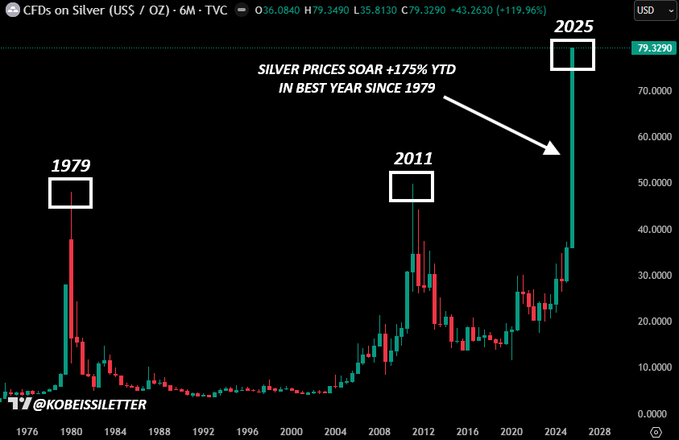نقره اما داستانی متفاوت و حتی هیجانانگیزتر داشت. نیمه اول سال برای نقره آرامتر گذشت؛ سال را با ۲۹ دلار آغاز کرد و تا اواخر اوت به ۳۹ دلار رسید. اما موتور اصلی در اواخر سال روشن شد. قیمت تا اواخر نوامبر به ۵۰ دلار رسید و سپس با هجوم سرمایهگذاران، تا پایان معاملات روز جمعه به نزدیکی ۸۰ دلار پرتاب شد و تمام رکوردهای قبلی را شکست. این یعنی یک جهش سه رقمی و بازدهی ۱۷۲ درصدی برای نقره.