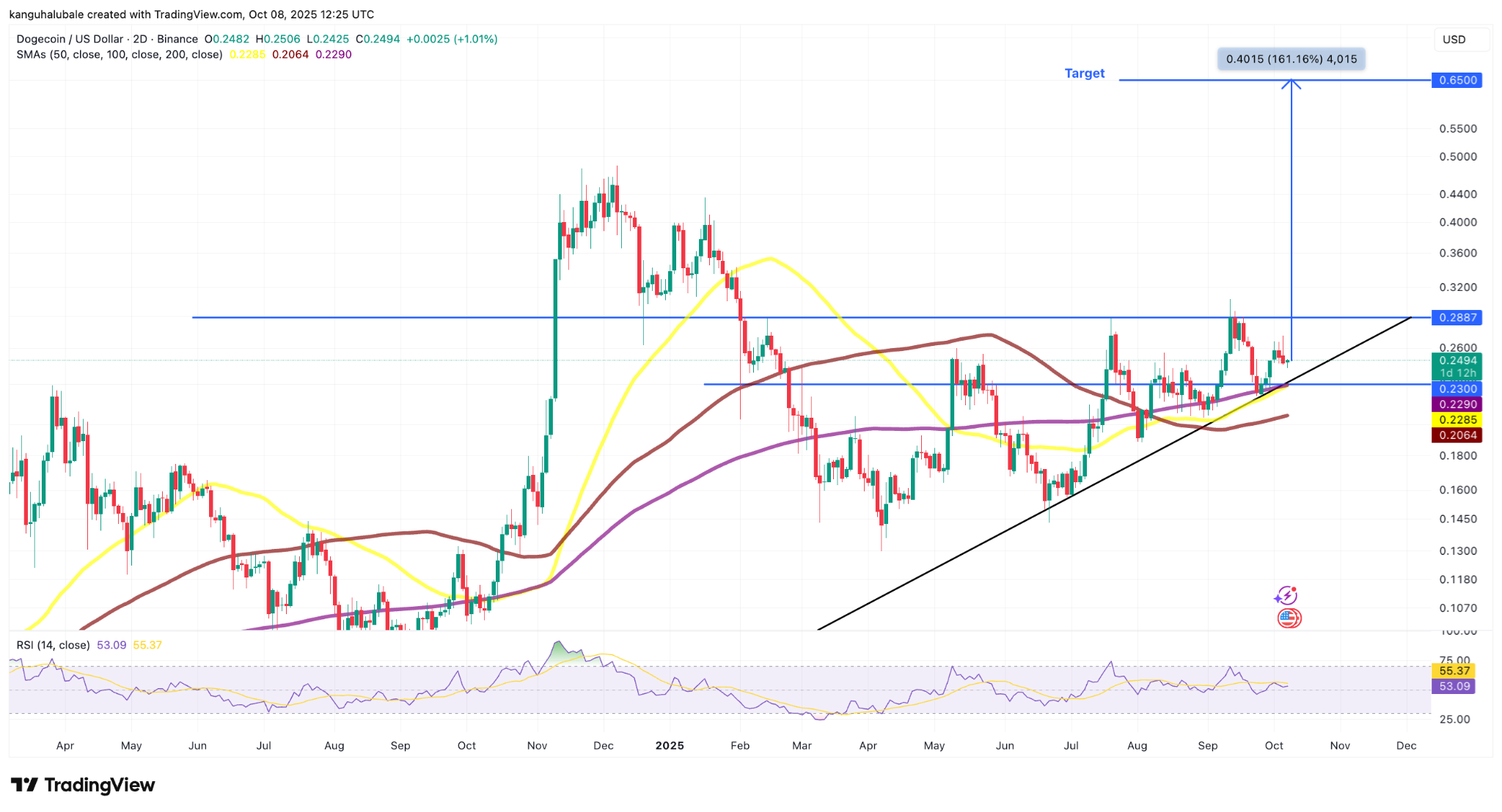 بر اساس الگوی مثلث صعودی در نمودار دو روزه، هدف قیمتی بعدی دوج‌کوین حدود ۰.۶۵ دلار برآورد می‌شود که معادل رشدی حدود ۱۶۰٪ از سطوح فعلی است.