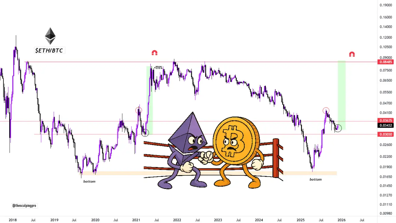 بر اساس تحلیل جدیدی که توسط معاملهگر Mags منتشر شده، نمودار ETH/BTC اکنون دقیقاً مشابه الگوی آغاز صعود بزرگ سال ۲۰۲۱ حرکت میکند. اتریوم طی چند سال گذشته روندی نزولی در برابر بیتکوین داشته است، اما کفسازی ماه آوریل و بازگشت قیمت از همان محدودهای که چرخه قبلی را آغاز کرده بود، نشاندهنده یک نقطه چرخش مهم است.