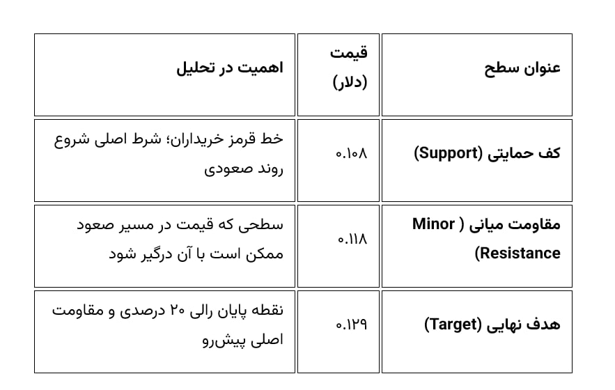 این سطح به عنوان یک خط دفاعی بسیار مهم برای خریداران عمل میکند. بررسی پیشینه نمودار نشان میدهد که قیمت در گذشته نیز به این سطح واکنش مثبت نشان داده و از همان نقطه تا قله ۰.۱۲۹ دلار یک رالی صعودی را تجربه کرده است. اکنون الگو در حال تکرار است؛ قیمت مجددا به محدوده ۰.۱۰۸ دلار بازگشته و در حال تست این حمایت حیاتی است.