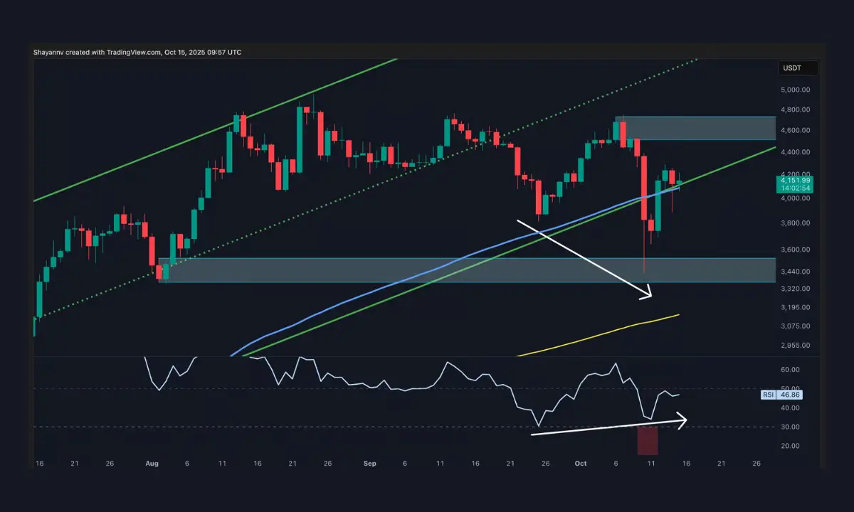 ۱. آیا اتریوم در حال حاضر در موقعیت امنی قرار دارد؟ خیر. با وجود بازگشت قدرتمند، قیمت همچنان زیر مقاومت‌های کلیدی (به ویژه ۴,۳۰۰ دلار) قرار دارد و در تایم‌فریم کوتاه‌مدت نیز یک الگوی بالقوه نزولی (کنج صعودی) در حال شکل‌گیری است.