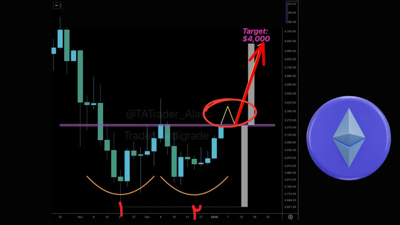 تحلیلگری به نام Trader Tardigrade در نمودار ۳ روزه اتریوم، شکلگیری الگوی کلاسیک کف دوقلو را شناسایی کرده است. این الگو در تحلیل تکنیکال معمولاً نشاندهنده پایان روند نزولی و آغاز یک حرکت صعودی قوی است. اگر این الگو تایید شود، هدف قیمتی اتریوم در محدوده ۴۰۰۰ دلار قرار خواهد گرفت.