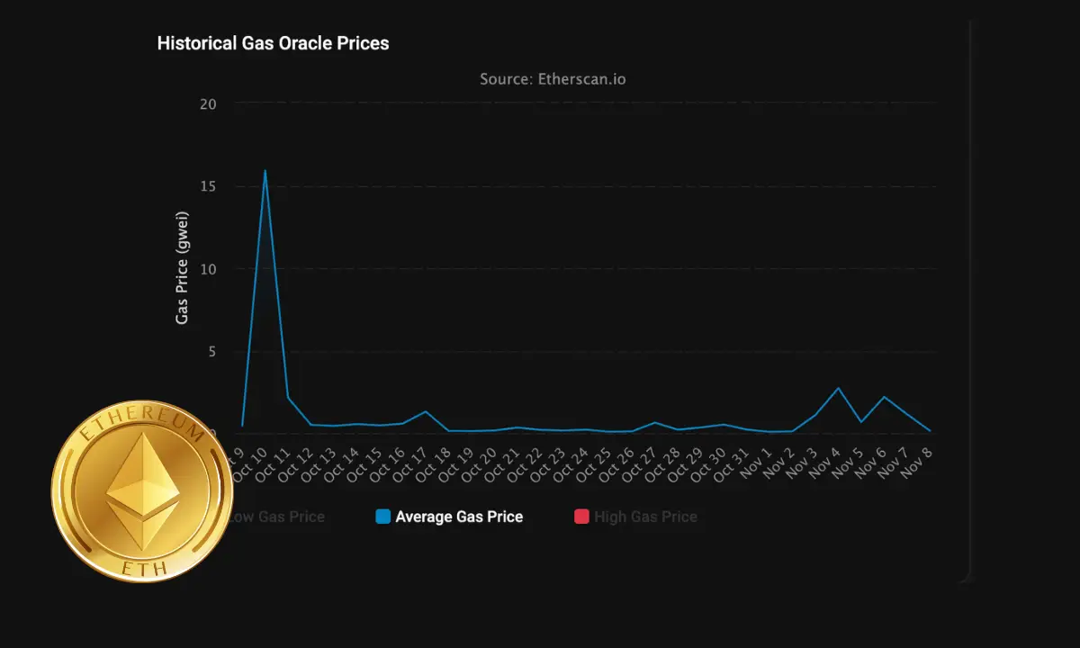 این ارقام در تضاد کامل با چند هفتهٔ گذشته قرار دارند. در ۱۰ اکتبر (روز سقوط بزرگ بازار)، میانگین کارمزدها به ۱۵.۹ Gwei رسیده بود، اما پس از آن به سرعت کاهش یافت و در بیشتر ماه اکتبر و نوامبر بسیار پایین باقی مانده است.