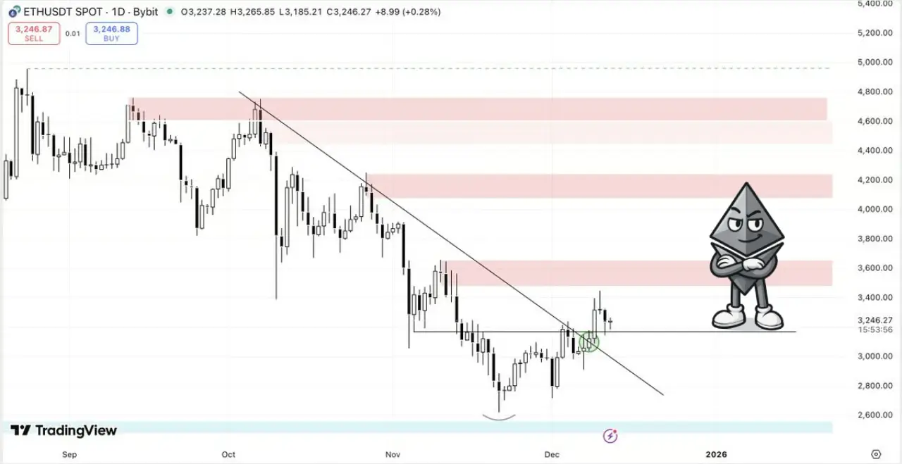 پس از شکستهشدن یک خط روند نزولی، اتریوم به عقب بازگشت تا این سطح را دوباره آزمایش کند. قیمت اکنون کمی بالاتر از این خط در حال نوسان است؛ خطی که از ماه اکتبر بهعنوان مقاومت عمل میکرد. حفظ این ناحیه میتواند نقش حمایتی مهمی ایفا کرده و زمینه را برای حرکتهای صعودی بعدی فراهم کند.