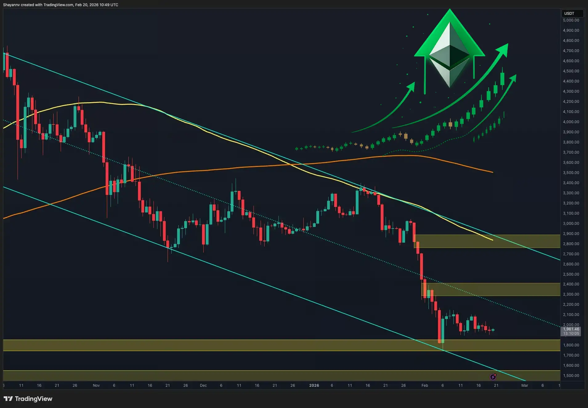 در نمودار روزانه، اتریوم همچنان درون یک کانال نزولی در حال نوسان است. خط میانی این کانال بهعنوان مقاومت پویا عمل میکند و محدوده ۱۸۰۰ دلار بهعنوان یک حمایت ساختاری قدرتمند شناخته میشود.