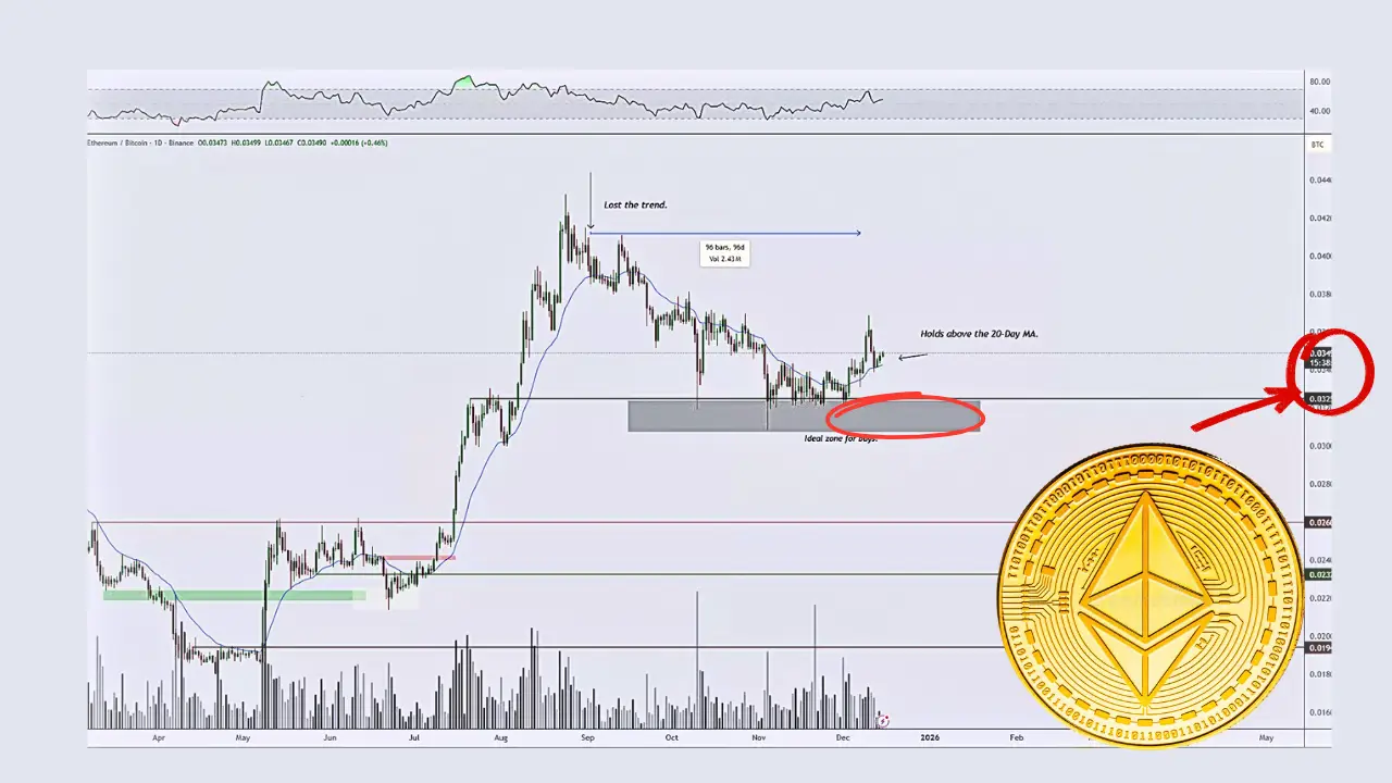 مایکل ون دی پوپ (Michaël van de Poppe) اشاره میکند که نمودار اتریوم نسبت به بیت کوین توانسته خود را بالای میانگین متحرک ۲۰ روزه نگه دارد. این نشاندهنده بهبود قدرت نسبی اتریوم است و میتواند فرصتی برای عملکرد بهتر نسبت به بیتکوین در هفتههای آینده باشد.