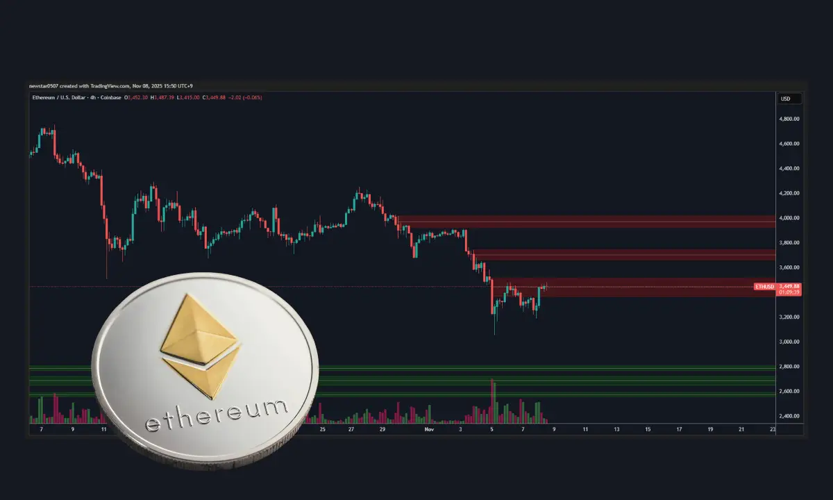 - مقاومت اول (دیوار فروش): به گفتهٔ تحلیلگر «CW»، یک دیوار فروش (Sell Wall) سنگین در محدودهٔ ۳,۴۵۰ دلار قرار دارد که مانع اول برای بهبودی قیمت است.