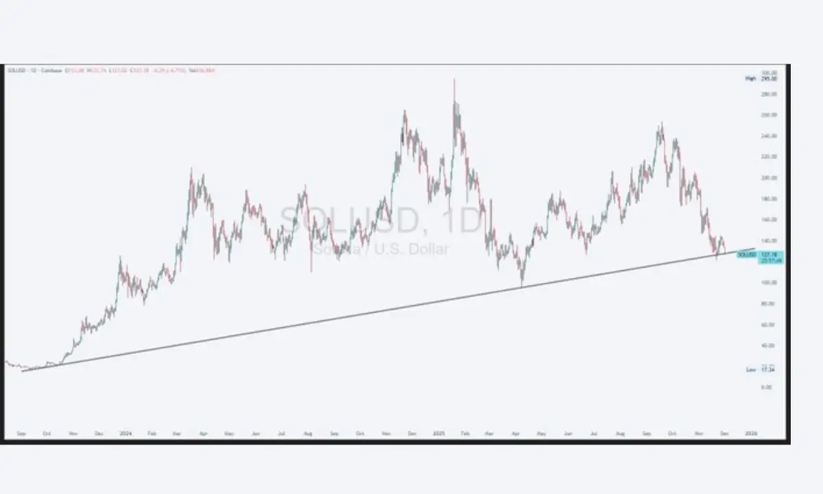 سولانا (SOL) ~$۱۲۷ خط روند صعودی (Trendline) حمایت دینامیک با سابقهٔ ۲+ ساله.
