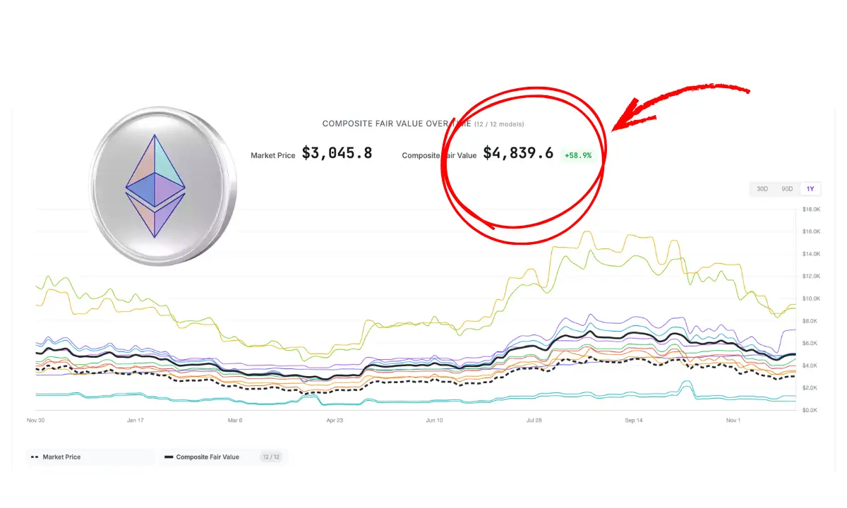 بر اساس تحلیل CryptoQuant، اگر میانگین ۱۲ مدل ارزش‌گذاری مختلف را در نظر بگیریم، «قیمت منصفانه» (Fair Value) ترکیبی برای اتریوم حدود ۴,۸۳۶ دلار است. این رقم نشان‌دهندهٔ پتانسیل رشد ۵۸ درصدی نسبت به قیمت‌های فعلی (حدود ۳,۰۰۰ دلار) است.