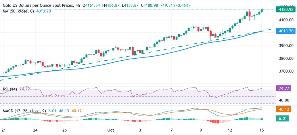 با وجود اینکه شاخص قدرت نسبی (RSI) در نواحی اشباع خرید قرار دارد، خریداران طلا هنوز از فشار فروش روند بازنگشتهاند. این امر نشان میدهد مسیر مقاومت کمتری به سمت بالا وجود دارد.