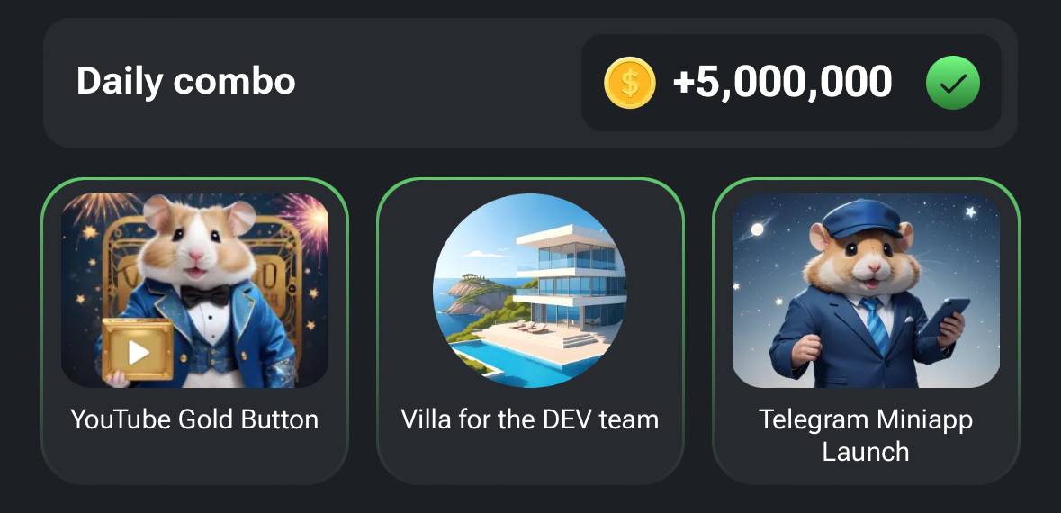 با وارد کردن ترکیب کمبو کارت های بالا در بازی تلگرامی همستر کامبت ۵،۰۰۰،۰۰۰ سکه جایزه بگیرید. هر روز کمبو کارت‌ها را در آکادمی تبدیل دنبال کنید.
