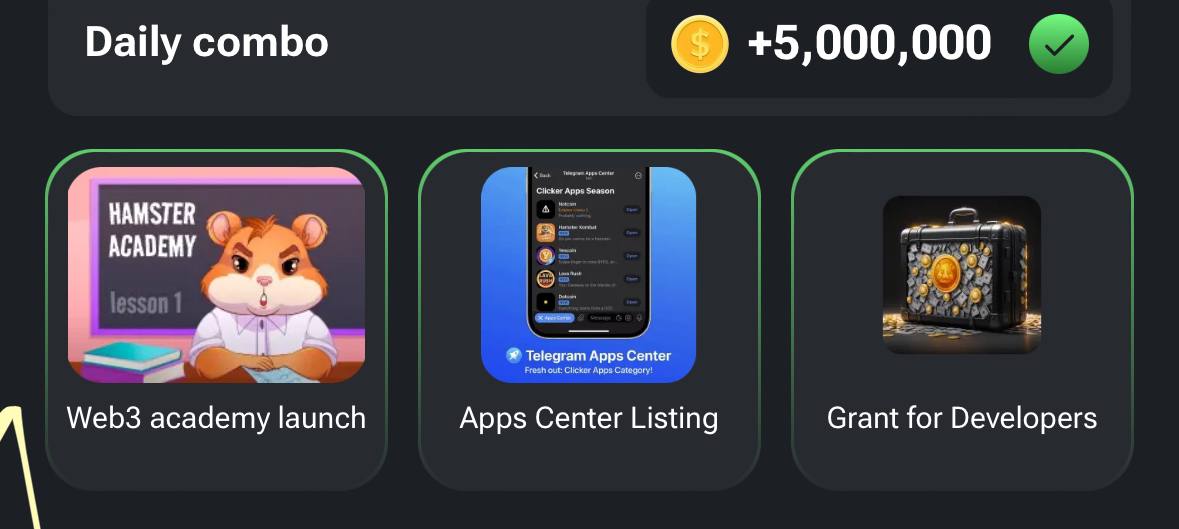 با وارد کردن ترکیب کمبو کارت های بالا در بازی تلگرامی همستر کامبت ۵،۰۰۰،۰۰۰ سکه جایزه بگیرید. هر روز کمبو کارتها را در آکادمی تبدیل دنبال کنید.