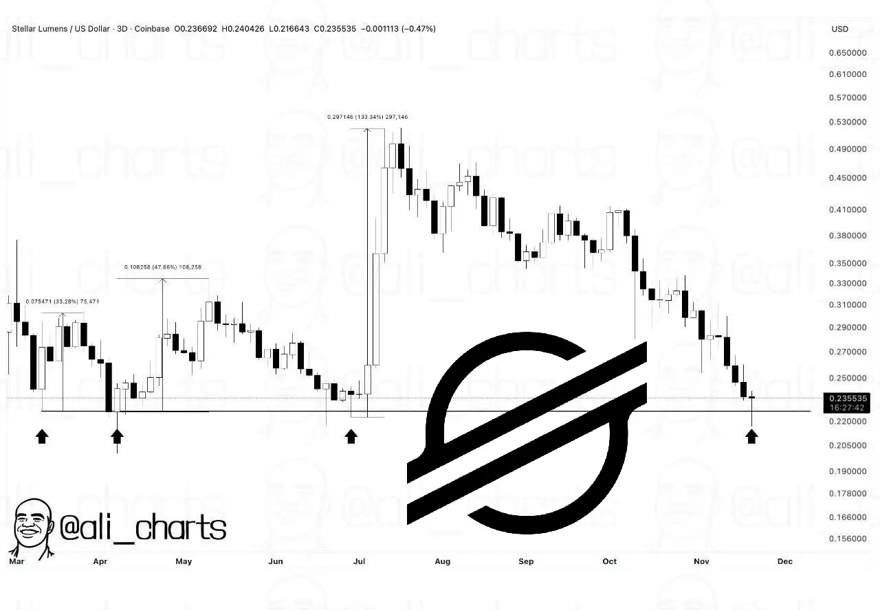 آخرین تحلیل منتشرشده توسط علی چارتز (ali charts) نشان می‌دهد که استلار (XLM) در سه برخورد گذشته با سطح ۰.۲۳ دلار واکنش‌های قدرتمندی داشته است. این ارز دیجیتال پس از لمس این ناحیه حمایتی، به ترتیب ۳۳٪، ۴۸٪ و ۱۳۳٪ رشد کرده است؛ داده‌هایی که توجه بسیاری از معامله‌گران را دوباره به این سطح کلیدی جلب کرده‌اند. حالا پرسش اصلی این است: آیا XLM بار دیگر همان الگو را تکرار می‌کند؟
