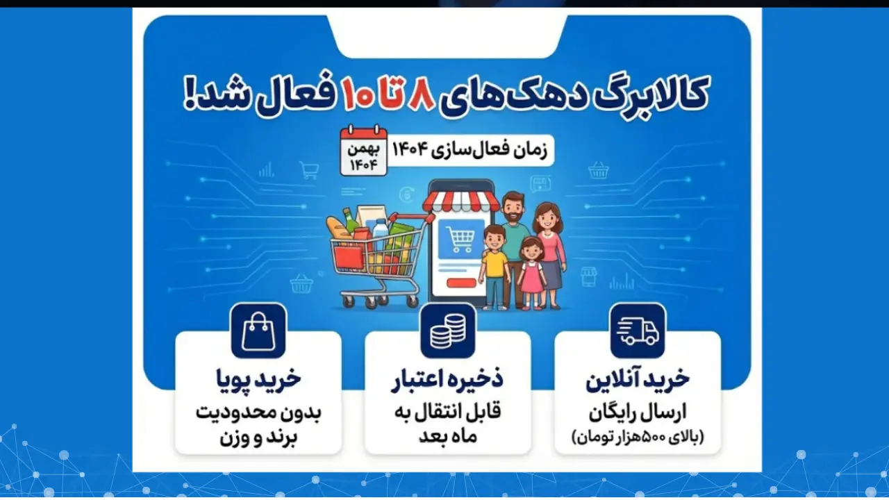 وزارت تعاون، کار و رفاه اجتماعی رسماً اعلام کرد که اعتبار کالابرگ الکترونیکی برای خانوارهای حاضر در دهکهای هشتم، نهم و دهم از روز شنبه ۲۵ بهمن ۱۴۰۴ فعال شده و قابل استفاده است. طبق این اطلاعیه، مشمولان میتوانند با مراجعه به فروشگاههای طرف قرارداد یا سامانههای آنلاین، نسبت به خرید اقلام اساسی اقدام کنند.