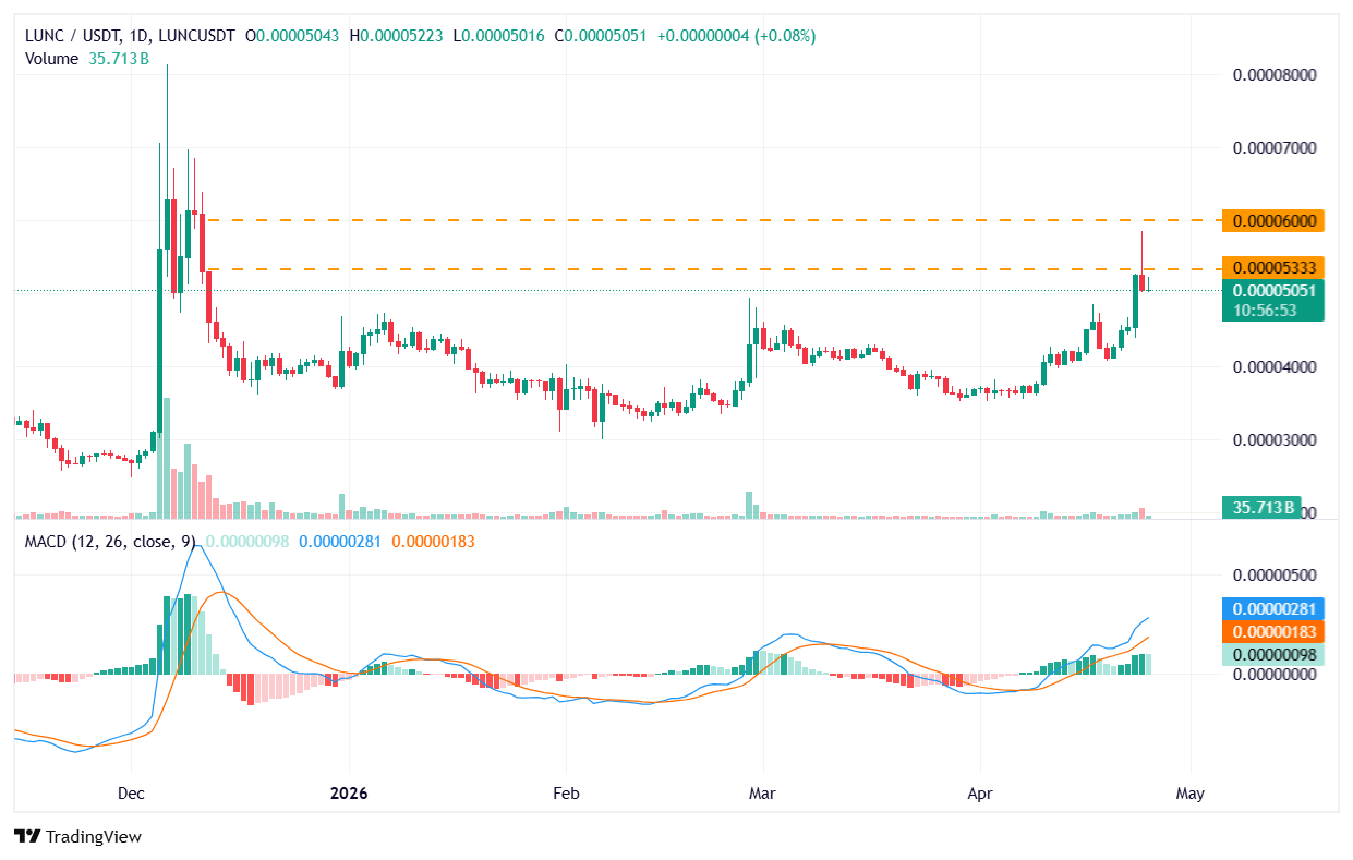 لونا کلاسیک (LUNC) در ۲۴ ساعت گذشته ۲۲.۸۳ درصد جهش کرده است. حجم معاملات هم بیش از ۱۸۰ درصد بالا رفته و ارزش بازار این ارز دیجیتال به ۲۹۷ میلیون دلار رسیده است.