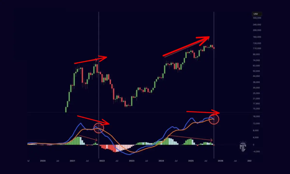 مهمترین سیگنال، تقاطع نزولی شاخص MACD در نمودار بلندمدت سههفتهای است. این سیگنال بسیار نادر است و در گذشته (مانند اواخر ۲۰۲۱) پیشزمینهٔ یک اصلاح قیمتی بسیار عمیق بوده است.