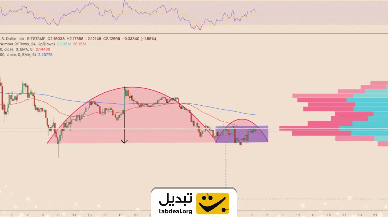 شاخص VPVR (نمودار حجم در نواحی قیمتی) نشان میدهد که ناحیه ۲.۱۰ تا ۲.۲۰ دلار، یک منطقه کلیدی با تراکم بالای حجم معاملات است. در صورتی که قیمت این ناحیه را از دست بدهد، به دلیل نبود حمایت تاریخی در سطوح پایینتر، احتمال ریزش شدیدتر وجود دارد.