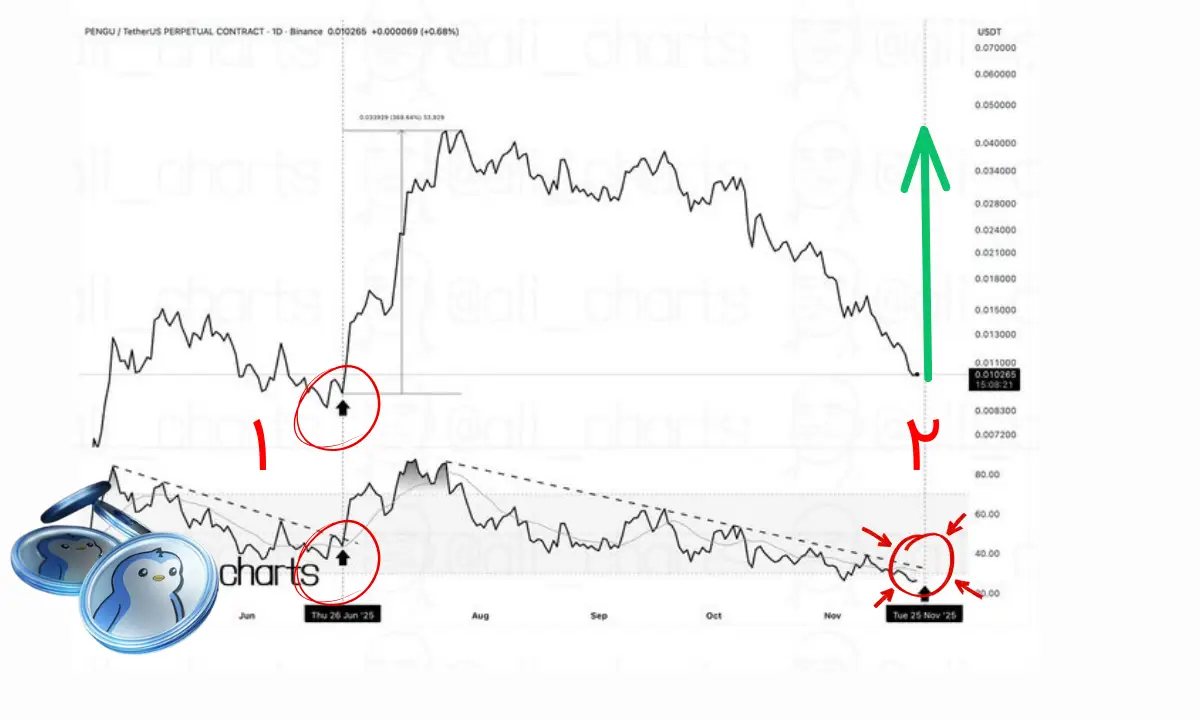 علی مارتینز، تحلیلگر مشهور بازار ارزهای دیجیتال، با انتشار توییت جدیدی در مورد میمکوین پاجی پنگوئن ها (PENGU)، توجه معاملهگران را به یک سیگنال تکنیکال بسیار قدرتمند جلب کرده است. او با اشاره به رفتار شاخص قدرت نسبی (RSI) در نمودار روزانه، معتقد است که تاریخ ممکن است در آستانهٔ تکرار باشد و یک جهش عظیم ۳۷۰ درصدی را رقم بزند.