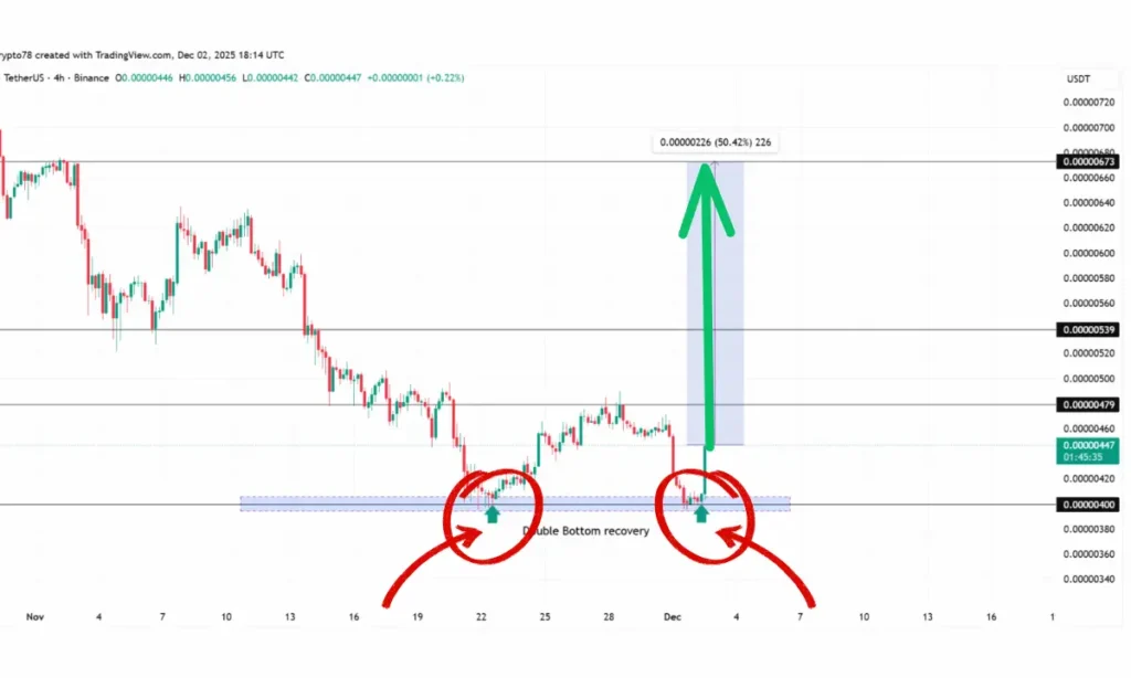 مهمترین سیگنال صعودی، تشکیل الگوی کف دوقلو (Double Bottom) است که یک الگوی بازگشتی قدرتمند محسوب میشود. این الگو نشان میدهد که خریداران در دو نقطه کلیدی وارد عمل شدهاند و کنترل بازار را در دست گرفتهاند. در حال حاضر، قیمت پپه روی ۰.۰۰۰۰۰۴۵۱ دلار قرار دارد و بالاتر از این سطح حمایتی تثبیت شده است.