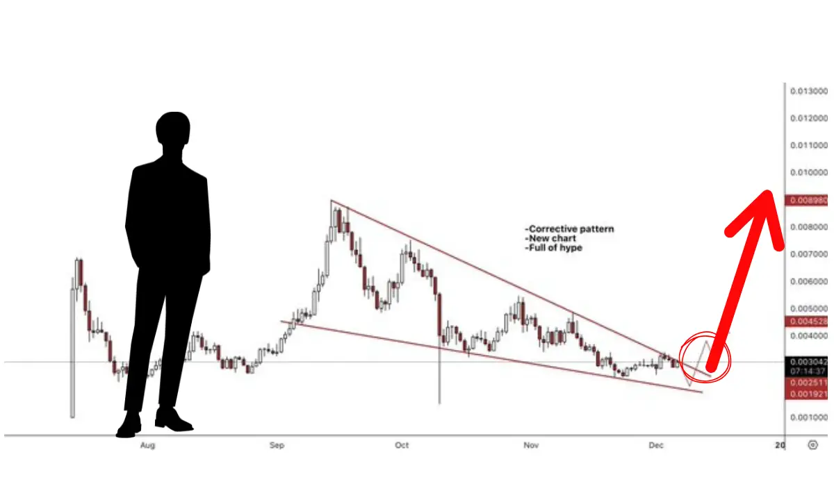 در نمودار منتشر شده، قیمت توکن PUMP درون دو خط همگرا که شیب نزولی دارند، محصور شده است. این ساختار دقیقاً تعریف کلاسیک الگوی کنج نزولی است.