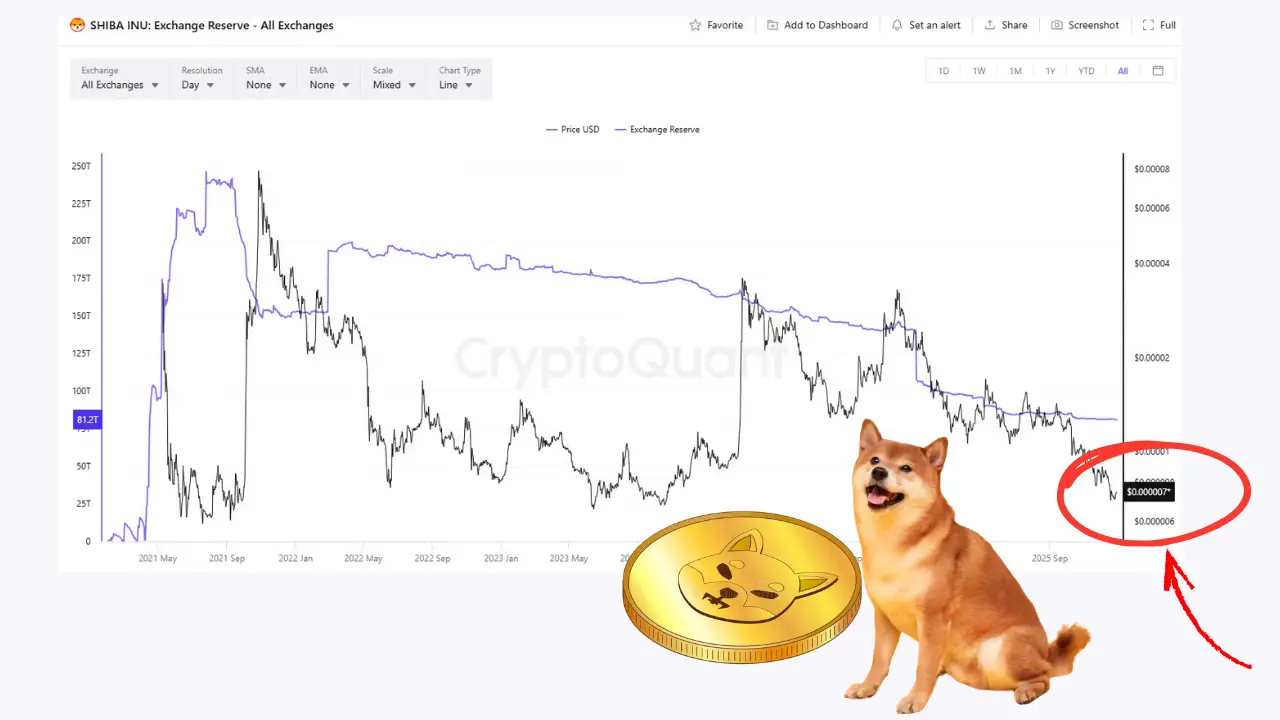 دادههای موسسه کریپتوکوانت (CryptoQuant) نشان میدهد که میزان توکنهای شیبا موجود در صرافیهای متمرکز کاهش چشمگیری داشته و در تاریخ ۲۸ دسامبر به حدود ۸۱.۲ تریلیون واحد رسیده است. این رقم، پایینترین سطح ذخایر صرافیها از آوریل ۲۰۲۱ تاکنون محسوب میشود.