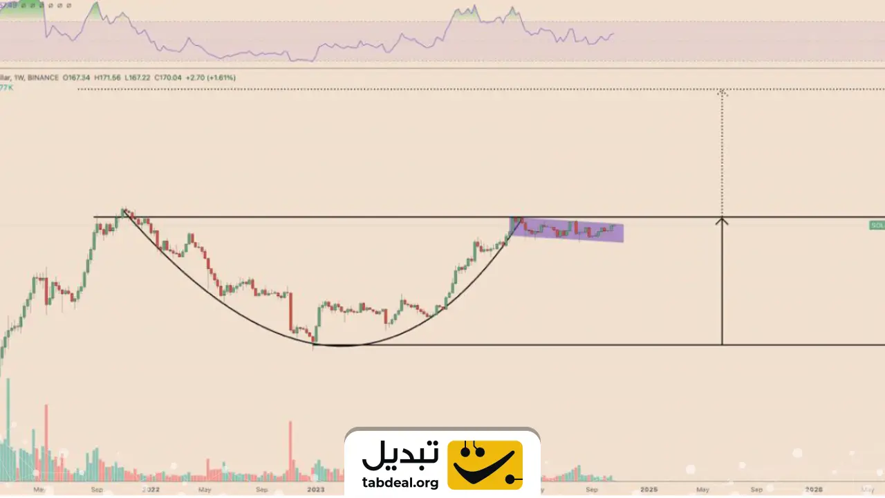 الگوی فنجان و دسته نشاندهنده یک فرصت بالقوه برای سرمایهگذاران سولانا است. اگر این الگو به تأیید برسد و شکست قیمت رخ دهد، ممکن است شاهد یک رشد چشمگیر در قیمت این ارز دیجیتال باشیم.