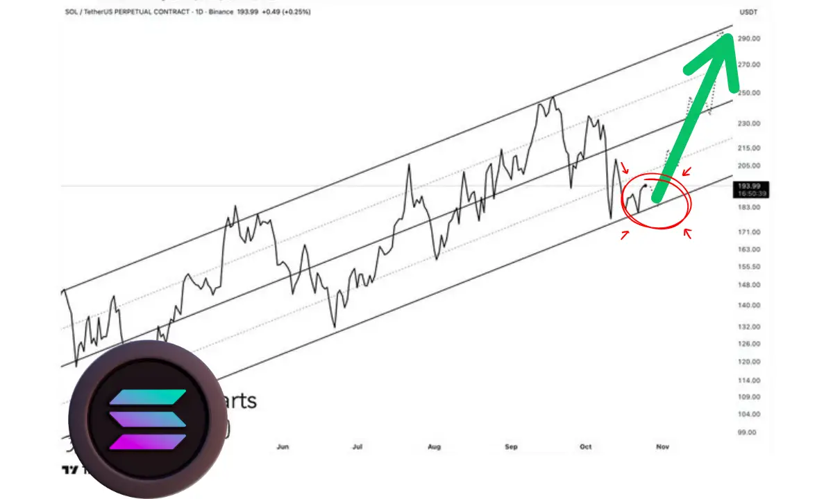 بر اساس نموداری که مارتینز به اشتراک گذاشته است، سولانا در یک کانال صعودی بلندمدت در حال حرکت است. این الگو که کفها و سقفهای بالاتری را به ثبت رسانده، نشاندهندهٔ روند صعودی پایدار این ارز دیجیتال است. در حال حاضر، قیمت در نزدیکی کف این کانال و در یک منطقهٔ حمایتی حیاتی در حدود ۱۸۰ دلار قرار دارد.