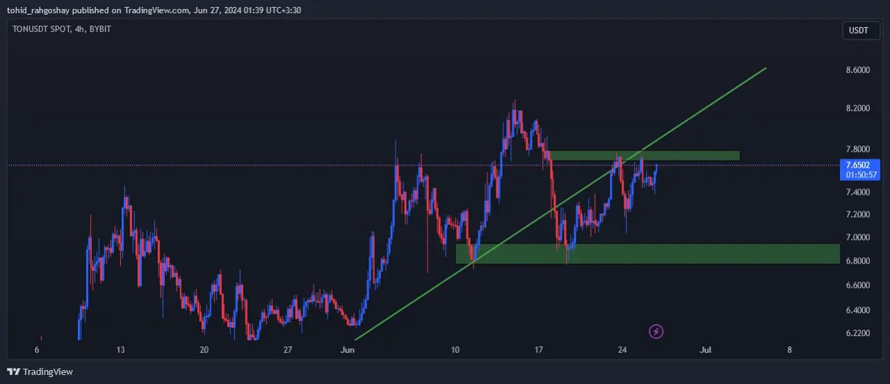 در صورتی که در تلاش اخیر، قیمت تون کوین موفق به ثبت قله بالاتر از قلههای قبلی شده و ناحیه مقاومتی خود را به سمت بالا بشکند، روند آن کاملا صعودی شده است و انتظار بالا رفتن بیشتری را نیز برای آن خواهیم داشت.