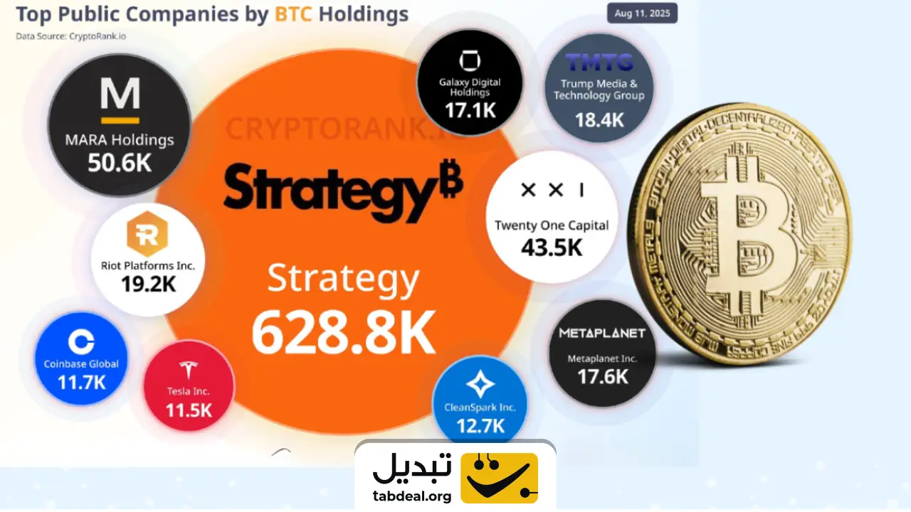 جدول ذخایر بیتکوین شرکتهای بزرگ (تا ۱۱ اوت ۲۰۲۵)