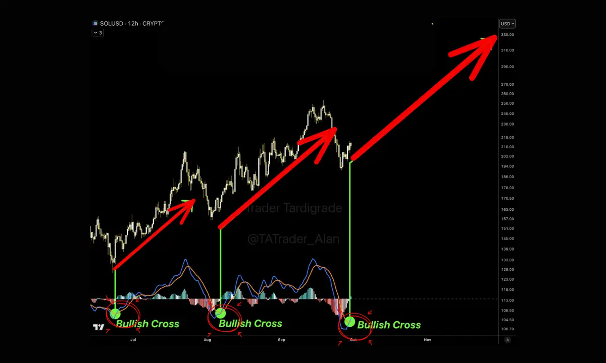 به گفتهٔ تحلیلگر «تریدر تاردیگرید»، هر بار که شاخص MACD در نمودار ۱۲ ساعتهٔ سولانا یک تقاطع صعودی را ثبت کرده، یک رالی قدرتمند و طولانی به دنبال آن رخ داده است. تقاطعهای مشابه در ماههای ژوئیه و آگوست، هر کدام به ثبت یک اوج قیمتی جدید منجر شدند.