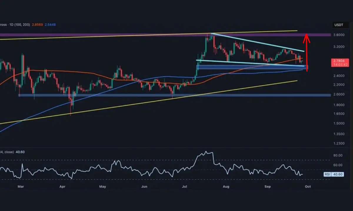 - سناریوی صعودی: اگر این حمایت حفظ شود، میتوان انتظار یک جهش به سمت سقف الگو در محدودهٔ ۳.۱۰ دلار و در صورت شکست آن، حرکت به سمت هدف ۳.۶۰ دلاری را داشت.