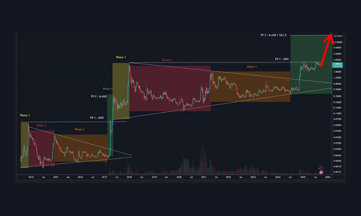 ارز دیجیتال ریپل (XRP) در حالی در محدودهٔ روانی ۳ دلار معامله می‌شود که تنها ۱۸ درصد با اوج تاریخی خود فاصله دارد. تحلیلگران با اشاره به تکرار یک الگوی قیمتی تاریخی که در گذشته به رالی‌های انفجاری منجر شده، پیش‌بینی می‌کنند که ریپل در آستانهٔ یک شکست بزرگ (Breakout) قرار دارد و اهداف قیمتی بسیار بالایی، از جمله ۲۲ دلار، می‌تواند در این چرخهٔ صعودی در دسترس باشد.